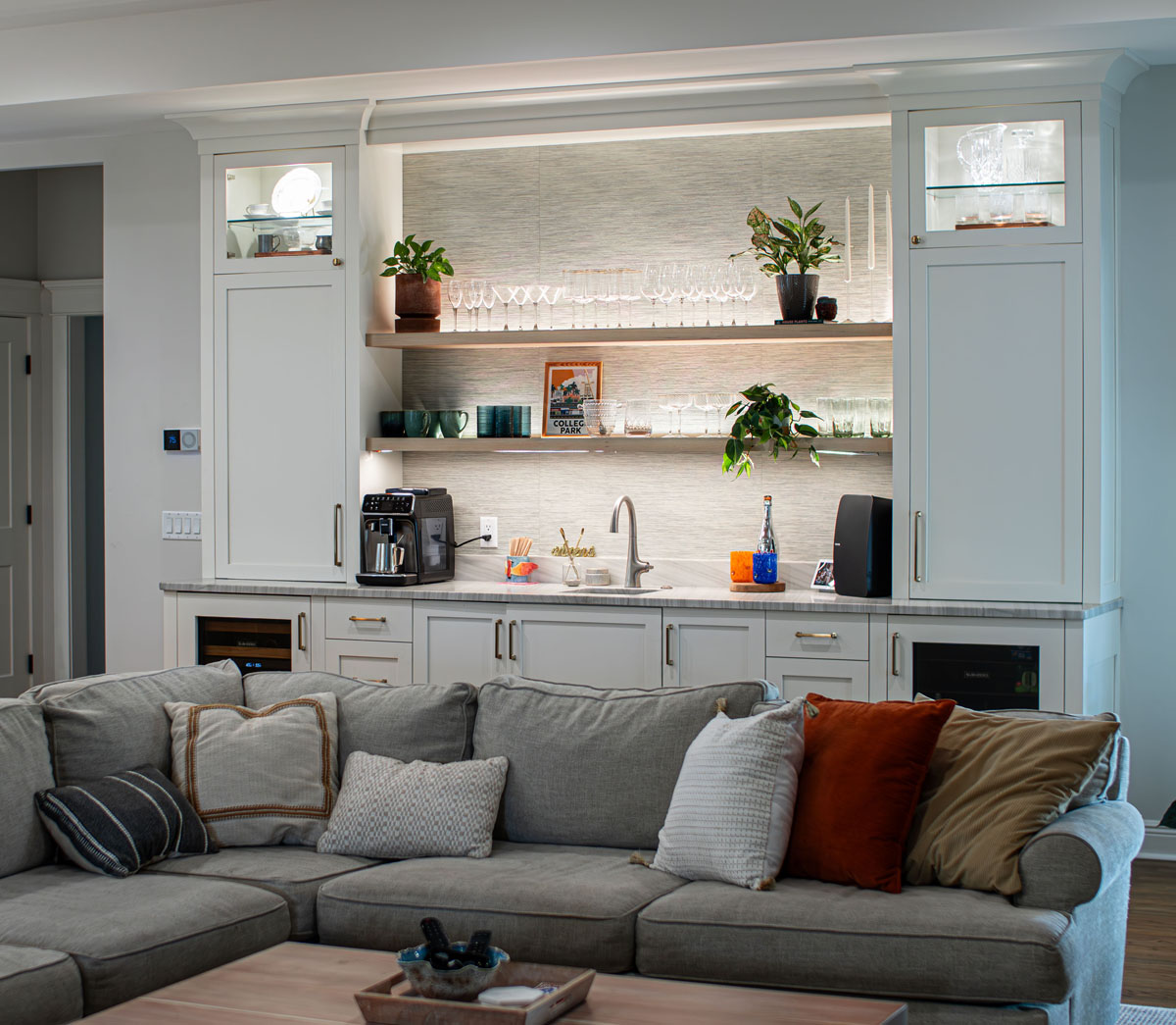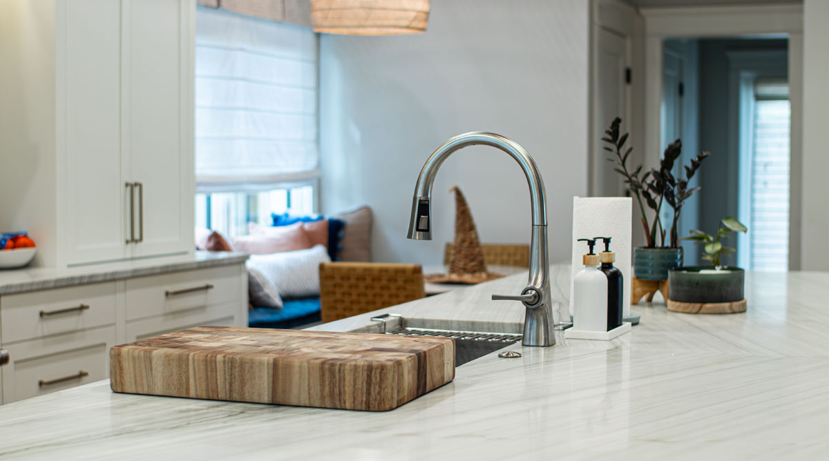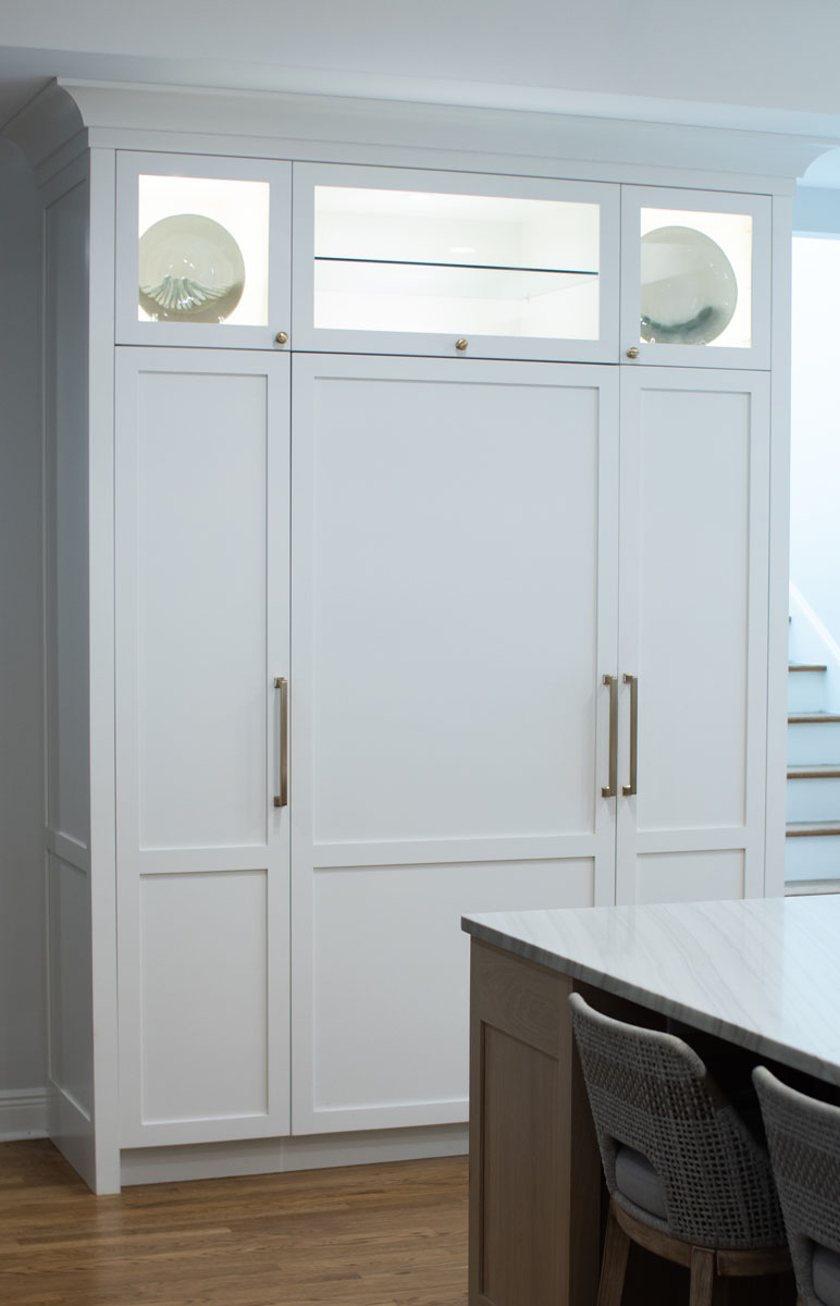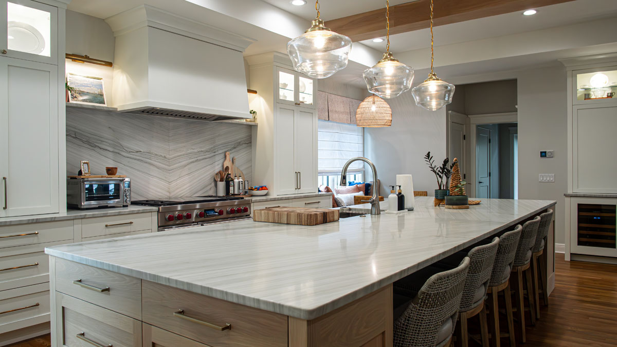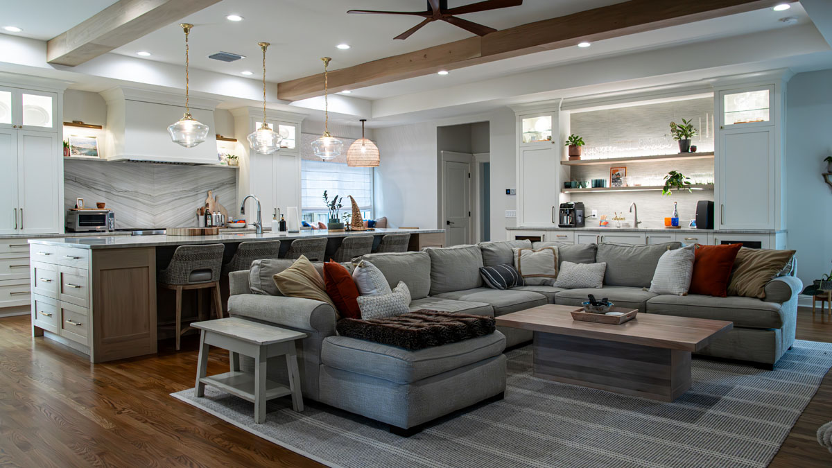 A kitchen that formerly had two supporting structural columns (which altered the view) needed to be removed. This was the owner’s goal. PSG was able to accomplish their goal. Opening the kitchen to the family room gave the owner the proper space they needed to function properly.