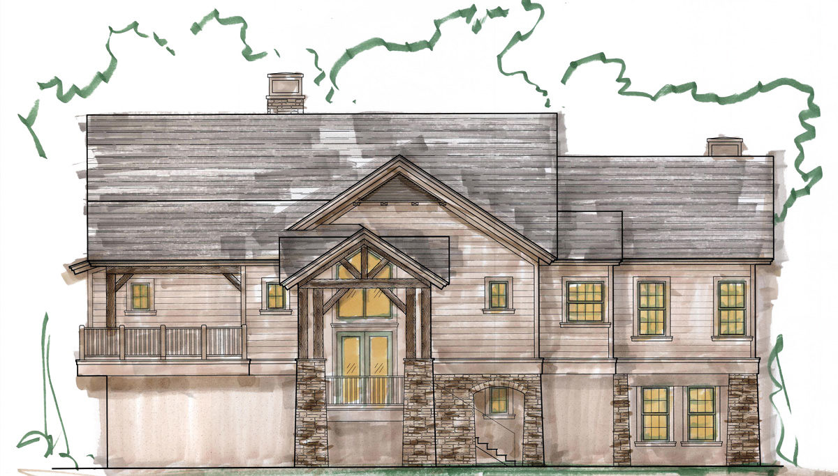 Front elevation of the 4,200 square foot vacation home. Rustic stone, cypress beams, stained concrete, and dark wood floors will lend themselves to the rustic lodge nature of this unique vacation home. The main living quarters are on the upper level to afford an ideal view of the 30 acre lake, and will contain a sprawling owner’s suite, guest suite, upper lounge, great room, wine room, kitchen with walk-in refrigerator and walk-in freezer, and covered deck.
